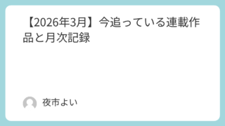 月次記事 【2026年3月】今追っている連載作品と月次記録 ・やる夫まとめサイト先月20話投稿…50(+2)シナリオ/81(+1)シナリオ夜神月 鈴原るる・先月読んだ本(☆はお勧め)…659(+31)冊/2867(+55)冊ゲーセン少女と異文化交流 1 (ドラゴンコミックスエイジ),2ライブダンジョ... 2026.03.01 0 月次記事