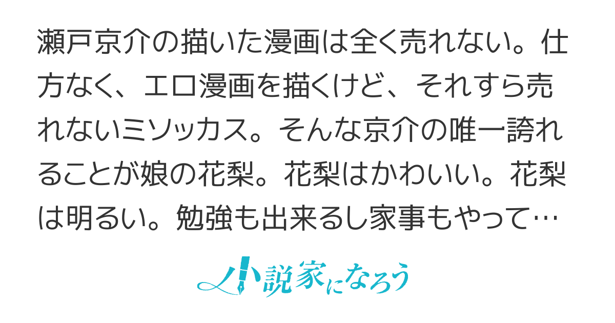 瀬戸京介の描いた漫画は全く売れない。仕方なく、エロ漫画を描くけど、それすら売れないミソッカス。そんな京介の唯一誇れることが娘の花梨。花梨はかわいい。花梨は明るい。勉強も出来るし家事もやってくれる。料理だって美味いんだ。もはや、日本一かわいい娘なんじゃないかと冗談半分で、言い換えれば半分本気で思ってる。