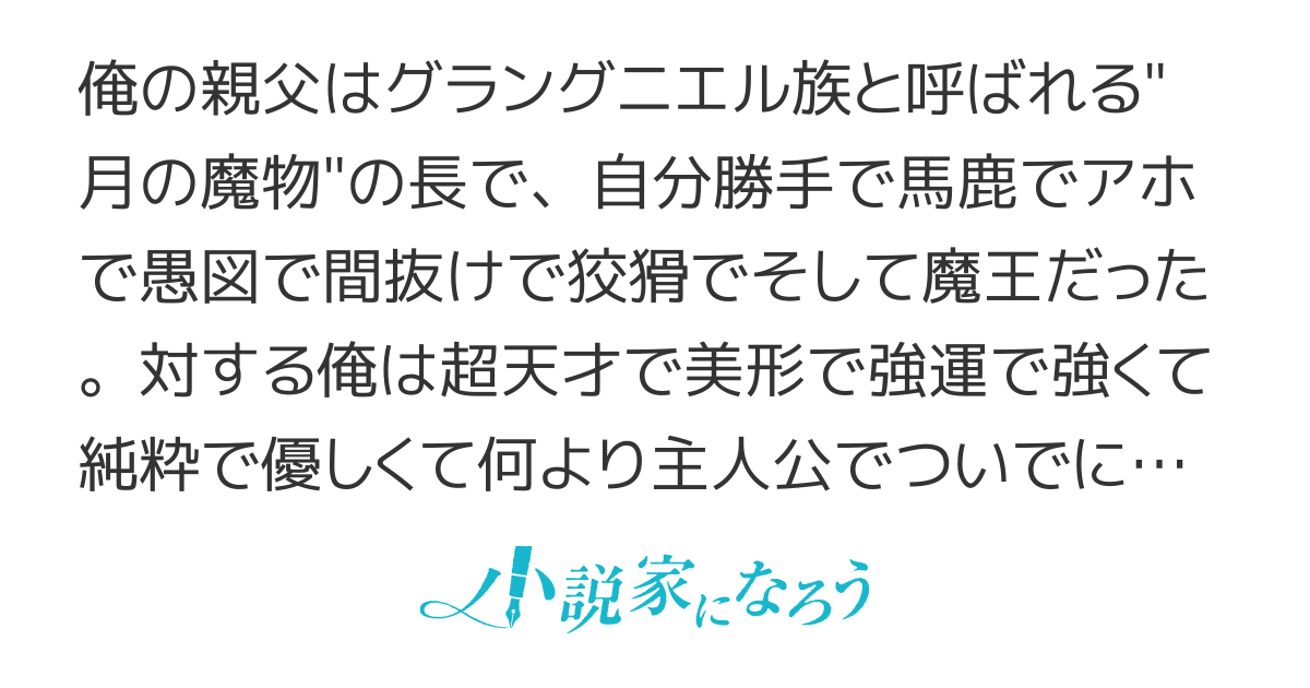 俺の親父はグラングニエル族と呼ばれる”月の魔物”の長で、自分勝手で馬鹿でアホで愚図で間抜けで狡猾でそして魔王だった。対する俺は超天才で美形で強運で強くて純粋で優しくて何より主人公でついでに魔王の第百二十三子。そんなすばらしい俺の栄光の物語(多少語弊あり)