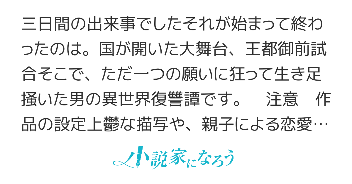 三日間の出来事でしたそれが始まって終わったのは。国が開いた大舞台、王都御前試合そこで、ただ一つの願いに狂って生き足掻いた男の異世界復讐譚です。