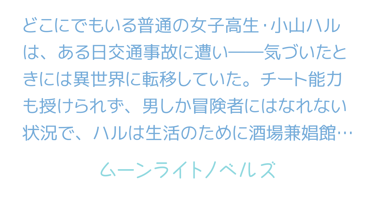 どこにでもいる普通の女子高生・小山ハルは、ある日交通事故に遭い――気づいたときには異世界に転移していた。チート能力も授けられず、男しか冒険者にはなれない状況で、ハルは生活のために酒場兼娼館『夜想の青猫亭』で働くことを決意する。だが男尊&女卑がはびこる異世界では理不尽なことも嫌なこともたくさんあって……。同じく現代から転移した同級生・千葉セイジ、娼館で働くルペやシクラソ、一途にハルに思いを寄せるスモーブとの出会いを経て、異世界に溶け込みはじめたハルを待ち受けていた過酷な運命とは……。