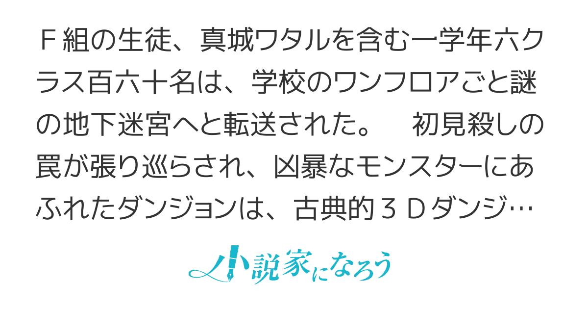 F組の生徒、真城ワタルを含む一学年六クラス百六十名は、学校のワンフロアごと謎の地下迷宮へと転送された。