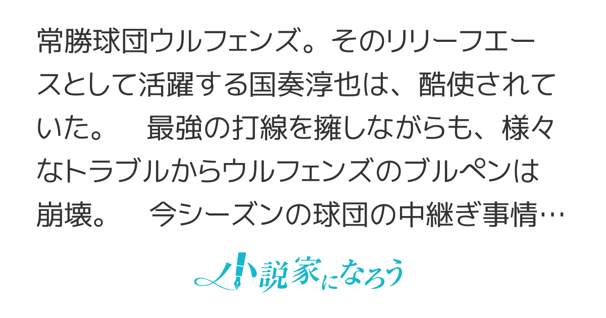 常勝球団ウルフェンズ。そのリリーフエースとして活躍する国奏淳也は、酷使されていた。