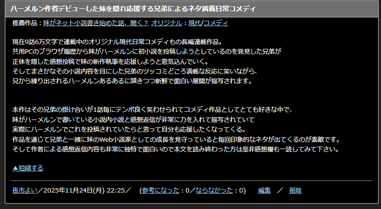 妹がハーメルンで書いている小説内小説と感想返信が非常に力を入れて描写されていて