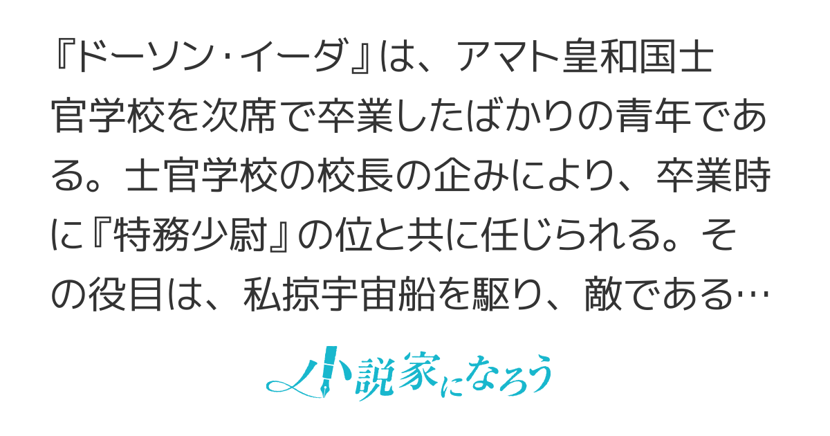『ドーソン・イーダ』は、アマト皇和国士官学校を次席で卒業したばかりの青年である。士官学校の校長の企みにより、卒業時に『特務少尉』の位と共に任じられる。その役目は、私掠宇宙船を駆り、敵である『人類統一国家スペース・ユニオン』の勢力下で、宇宙海賊として働くこと。任務で与えられる皇和国からの支援は、私掠船≪大顎≫号と初期物資のみ。任務のお供もコミュニケーション用人工知能の『オイネ』だけ。