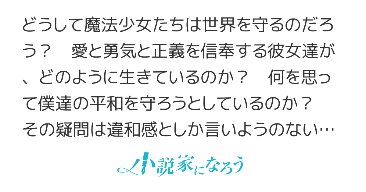 どうして魔法少女たちは世界を守るのだろう? 愛と勇気と正義を信奉する彼女達が、どのように生きているのか? 何を思って僕達の平和を守ろうとしているのか?