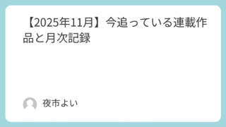 月次記事 【2025年11月】今追っている連載作品と月次記録 ・やる夫まとめサイト先月22話投稿…35(+3)シナリオ/79(+0)シナリオ聖白蓮 鬼舞辻無惨 エドワード・先月読んだ本(☆はお勧め)…532(+13)冊/2540(+23)冊騎士爵家 三男の本懐転生程度で胸の穴は埋まらない (電撃文庫)... 2025.11.01 0 月次記事